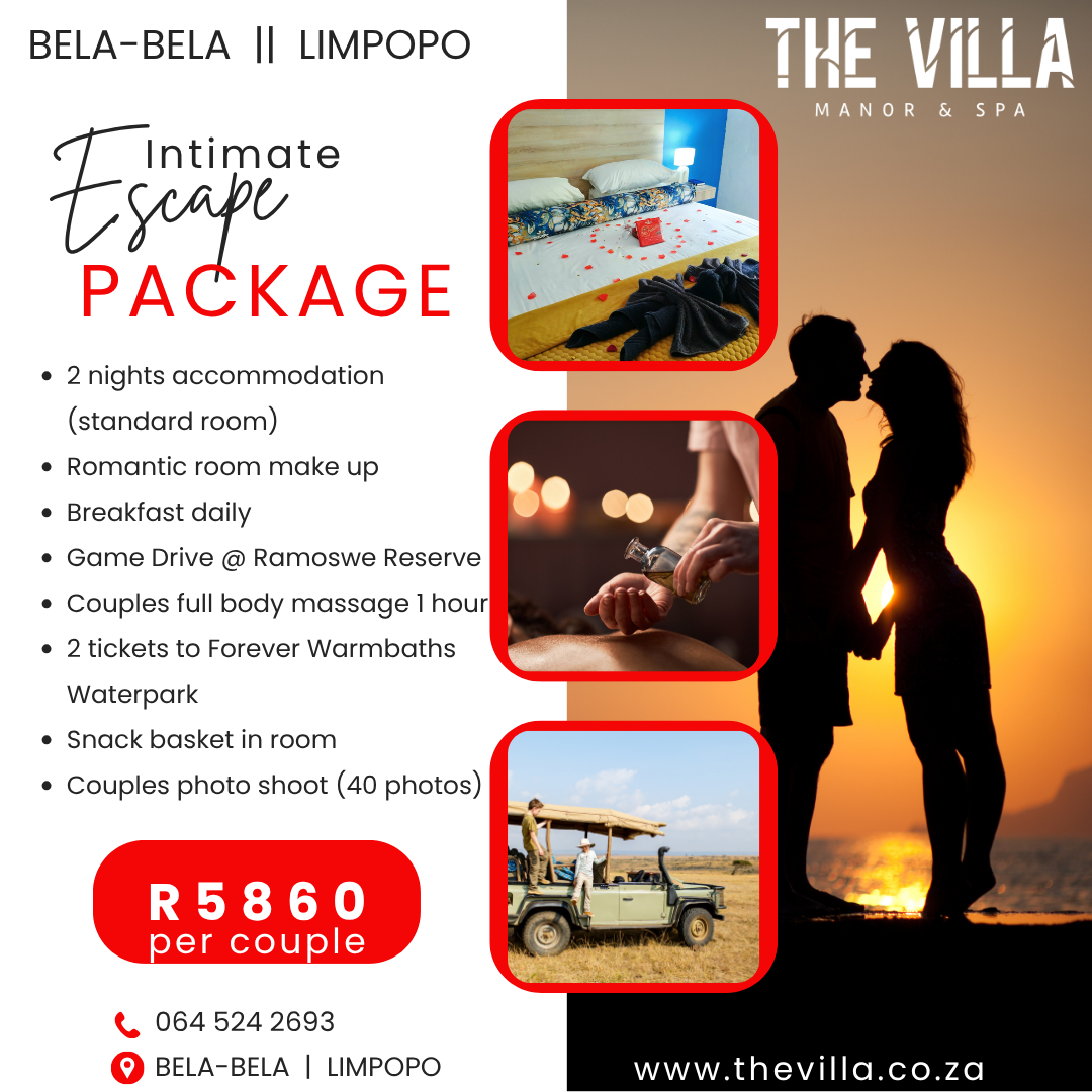 Embark on a romantic journey like no other with our exclusive Couples Retreat Package, a harmonious blend of adventure, relaxation, and intimate moments. Begin your retreat with an exhilarating game drive through breathtaking landscapes, where the beauty of nature sets the stage for a memorable escape. After a day of exploration, indulge in spa treatments designed to rejuvenate your senses, followed by a romantic room turndown that transforms your accommodation into a private oasis of love. Relish in the enchantment of a personalized picnic basket, creating a picturesque moment for you and your partner. As the sun sets, capture the magic with a professional photo shoot, immortalizing the love and connection you share. This retreat is a curated experience, inviting you to savor every moment of togetherness and create lasting memories in a haven of romance.