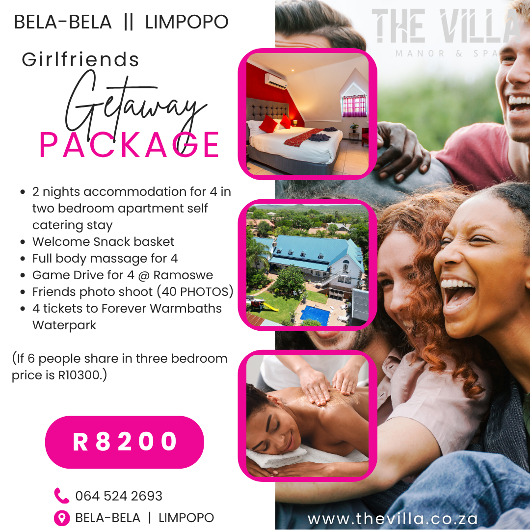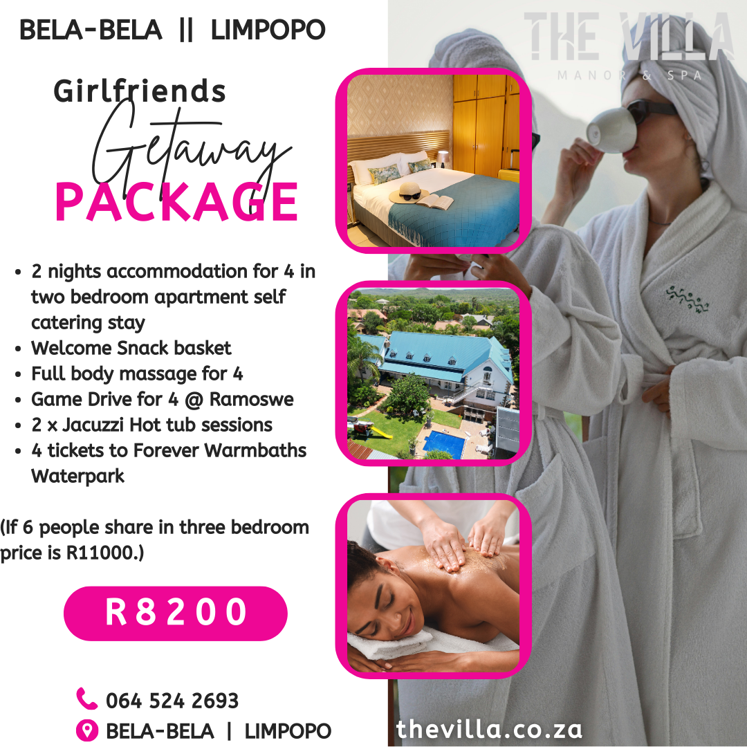 Unwind and reconnect with your besties at The Villa Manor and Spa's exclusive Girlfriends Getaway Package. Escape to the serene beauty of Bela Bela for a weekend of laughter, pampering, and unforgettable memories. Indulge in luxurious spa treatments, sip cocktails by the pool, and enjoy gourmet meals prepared just for you. Whether you’re lounging in our elegant suites or exploring the local attractions, our bespoke getaway is designed to offer the perfect blend of relaxation and adventure. Reignite your friendship with a touch of luxury and a lot of fun at The Villa Manor and Spa. Book your getaway today and create the stories you’ll talk about for years!