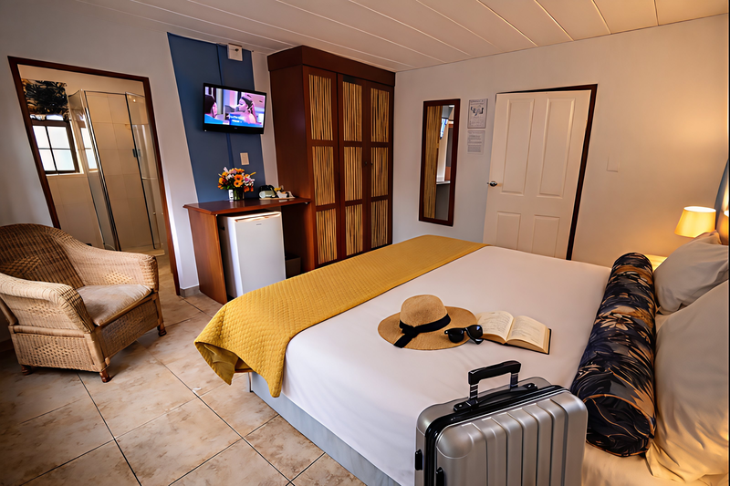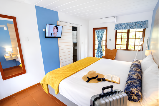 Features a roomy super-king bed with crisp, white linen, king pillows for added comfort, and clean towels. Flat-screen TV with Netflix, coffee and tea maker, bar fridge, and air conditioning are all available for your enjoyment. Internet access is available without charge. A shower or a bathtub is available in the room's en-suite bathroom.